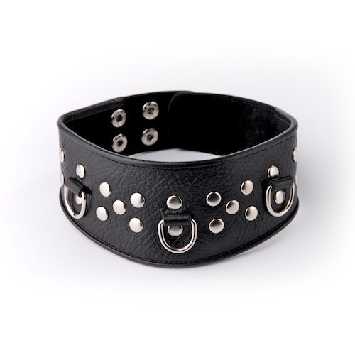 Изготовлен из натуральной кожи с велюровой подкладой. При изготовлении использована никелированная фурнитура. Размер универсальный. Один из основных атрибутов BDSM.