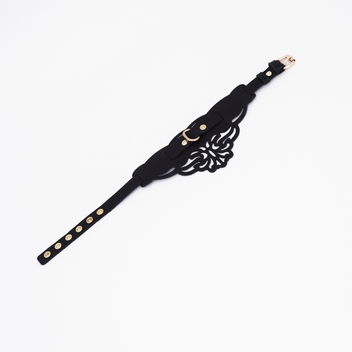 Чокер фигурный из натуральной кожи, украшенный узорами. Каждый элемент дизайна тщательно проработан, чтобы подчеркнуть красоту и элегантность изделия. Золотая фурнитура, сверкающая на фоне черной кожи, добавляет утонченности и изысканности.