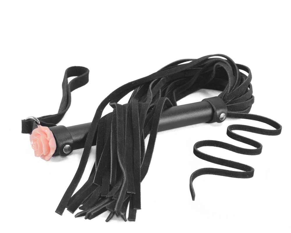 Плеть изготовлена из натуральной велюровой кожи. Цвет черный. Торец металлической рукояти украшена акриловой розой. Общая длина 57-60 см. Количество лент в хвосте 25-26. Длина рукояти 17 см, длина хвостовой части 39 см.