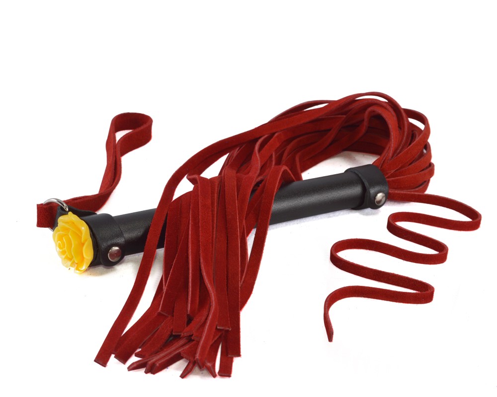 Плеть изготовлена из натуральной велюровой кожи. Цвет красный. Торец металлической рукояти украшена акриловой розой. Общая длина 57-60 см. Количество лент в хвосте 25-26. Длина рукояти 17 см, длина хвостовой части 39 см.